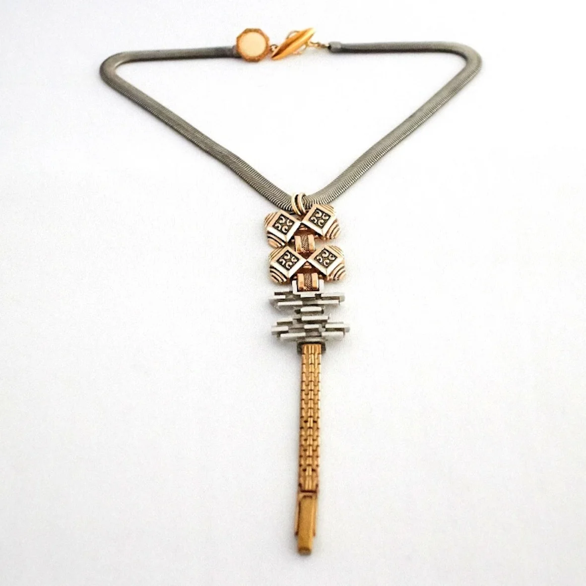 Inspiration for these unique designs mainly come from the vintage components I find; they often dictate where they want to sit and how I can make them ‘shine again’; for example, using vintage belt buckles, turning them into centre pieces for the ‘tie-design’ necklaces